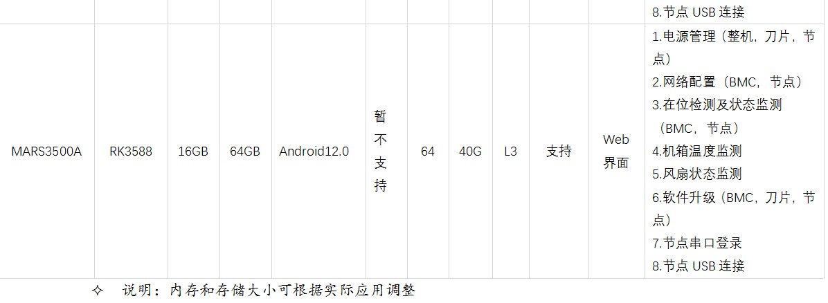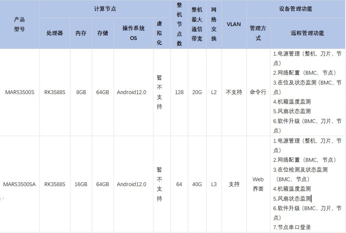 - MARS3500系列服務器產品,包含MARS3500S、MARS3500SA、MARS3500A三款產品,詳細規格如下表所示。